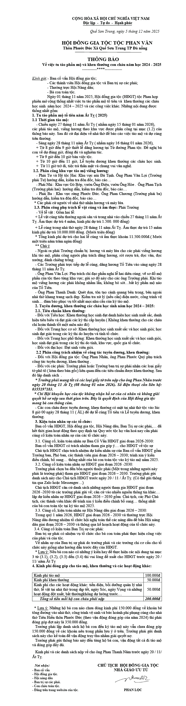 Thông báo Về việc tu tảo phần mộ và khen thưởng con cháu năm học 2024 - 2025